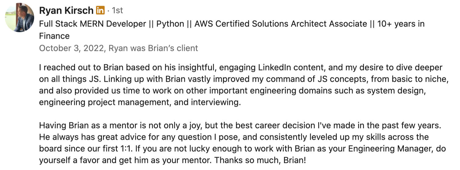 Still on the fence?Success loves speed.Failure favors indecision.Also - seriously, you're going to learn a lot. I've crafted these challenges to mimic the kinds of experiences it takes most people years to encounter. Build your own NPM library, debug Github Actions pipelines, learn how to enforce code quality, have better stand-ups, write better peer reviews and architect front end apps.See you inside!- Brian